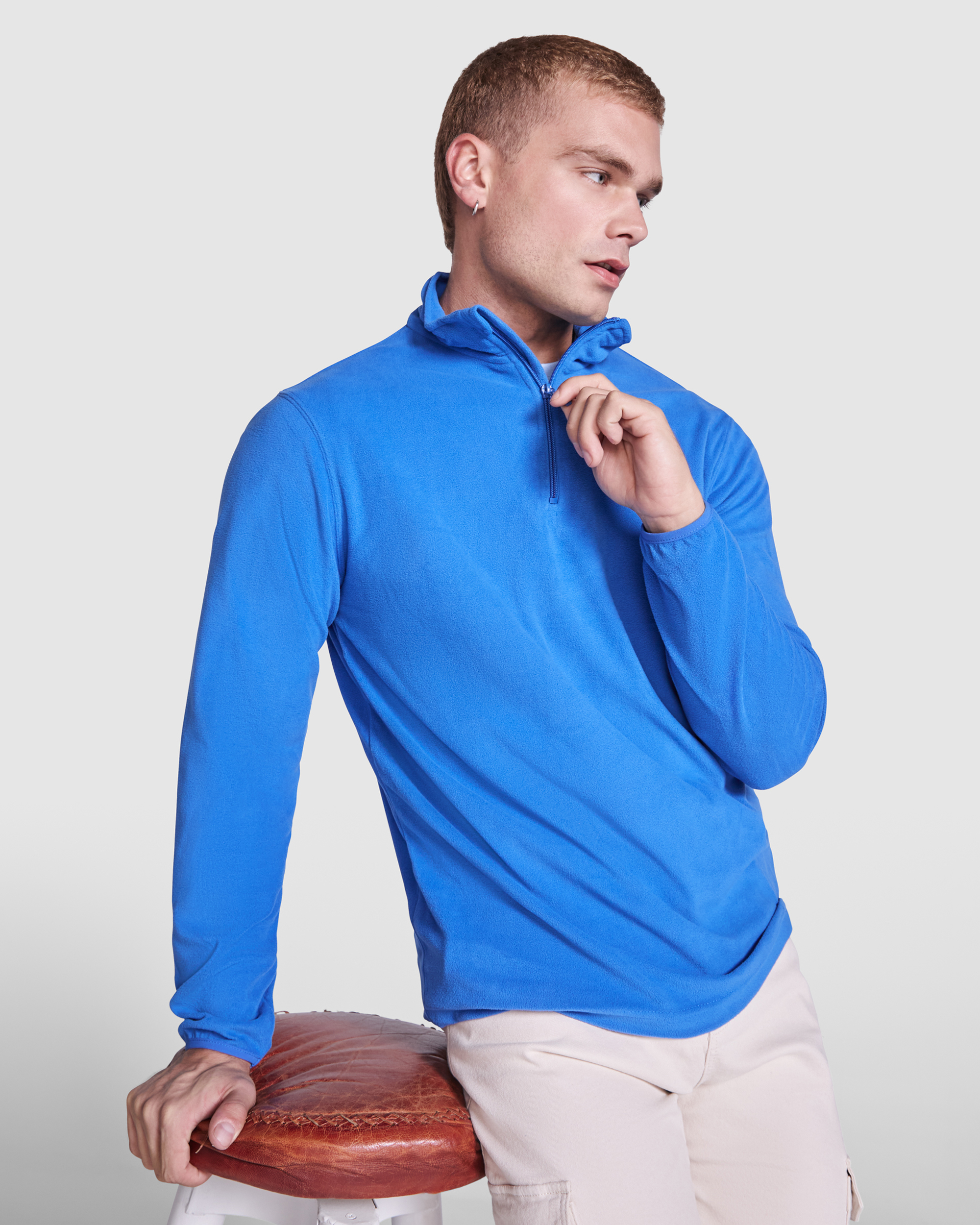 Sudadera micropolar de media cremallera y cuello alto. Puños con vivo elástico. Protector de barbilla en el mismo tejido.